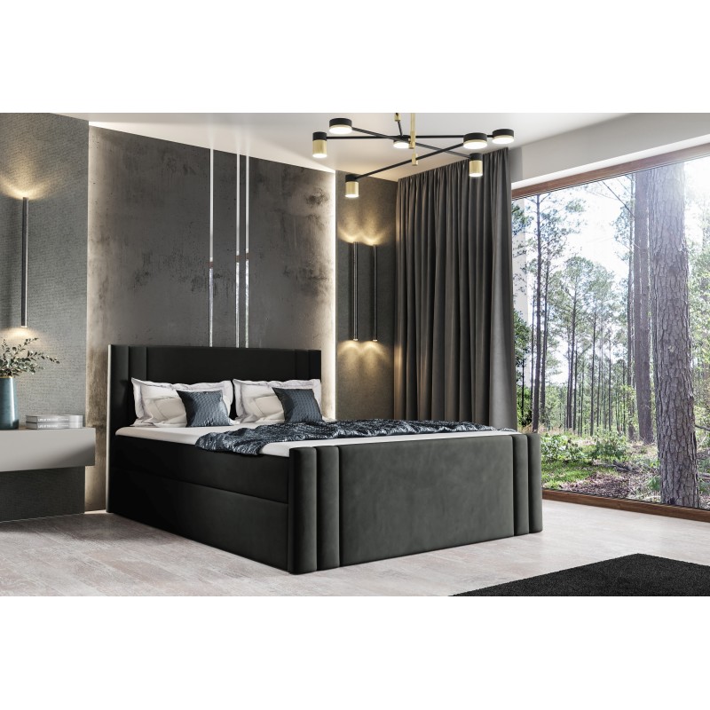Das Boxspringbett Sovo verfügt über zwei große Schubladen für Bettwäsche. Ein Federmechanismus erleichtert den Zugang zum Bettwäschebehälter, während dekorative Nähte am Kopfteil und an der Vorderseite dem Möbelstück Charakter verleihen. Besonders hervorzuheben ist die Matratze – sie besteht aus einer Bonellfederung und einer zusätzlichen Auflegematratze (TOPPER) aus T-25-Schaumstoff mit einer Höhe von 4 cm, was für unvergleichliche Unterstützung und Komfort während des Schlafs sorgt.