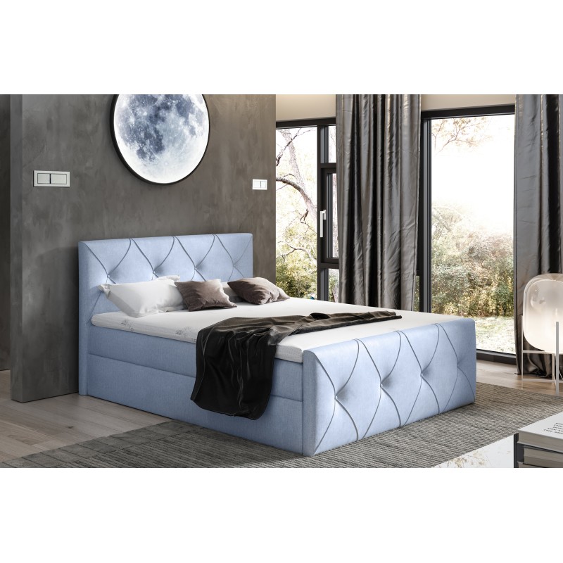 Der wichtigste Vorteil dieses Bettes sind jedoch die Funktionen, die es von anderen abheben. Es stehen zwei Bettkasten zur Verfügung, die helfen, Ordnung im Schlafzimmer zu halten. Außerdem erleichtert das Fehlen von Beinen und das Vorhandensein eines Kunststoffgleiters das Bewegen des Möbelstücks, und ein spezieller Mechanismus erleichtert das Öffnen des Bettkastens und sorgt für Komfort bei der Nutzung. Zum Bett gehört eine Auflage (TOPPER) aus T-25 Schaumstoff mit einer Höhe von 4 cm sowie eine Hauptmatratze aus Bonell-Federn - beide bieten optimale Schlafbedingungen.