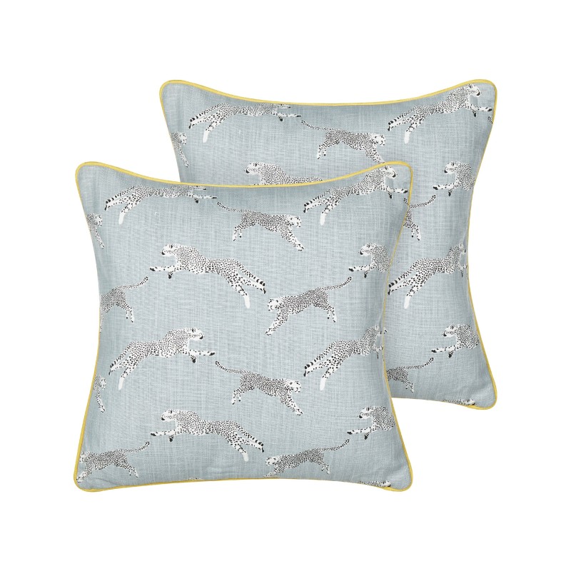 Legen Sie diese Kissen auf das Bett oder Sofa, um dem monotonen Innendekor neues Leben einzuhauchen. Mit einem dynamischen Gepardenmotiv gestaltet, passen sie in ein Kinderzimmer, können aber auch jedes moderne Wohnzimmer schmücken. Die Vorderseite mit Druck sowie die glatte Rückseite der Kissen bestehen aus Baumwolle, und die Bezüge sind zusätzlich mit einer Paspelierung versehen.
