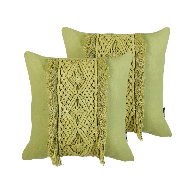 Bereichern Sie Ihren Raum mit diesem handgefertigten Set aus Baumwollkissen mit kunstvollen Vorderseiten aus Makramee. Die Bezüge lassen sich dank der dezent integrierten Reißverschlüsse mühelos abnehmen, wodurch Komfort mit Stil kombiniert wird. Diese Kissen, ausgestattet mit flauschigen Füllungen, verleihen jedem Raum eine raffinierte und gemütliche Atmosphäre.