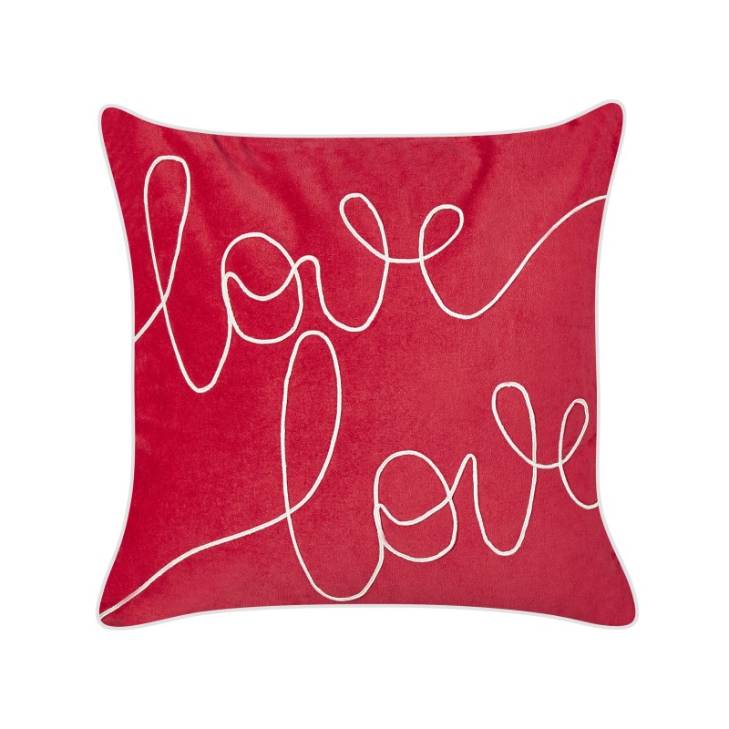 Dieses weiche, plüschige und angenehm anzufassende Kissen verleiht Ihrem Wohnzimmer oder Schlafzimmer eine romantische Atmosphäre. Handgefertigt aus Velours, ist das Kissen mit einer gestickten, weißen Aufschrift auf einem auffälligen, roten Hintergrund verziert - diese Kombination wird sicherlich die Aufmerksamkeit Ihrer geliebten Person auf sich ziehen. Das Kissen ist dank des abnehmbaren Bezugs leicht zu reinigen und zudem sehr langlebig, so dass es Ihr Zuhause viele Jahre lang schmücken wird.