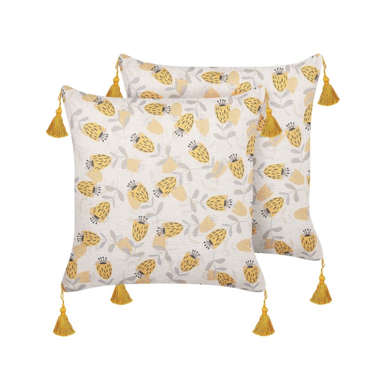 Bringen Sie frischen Frühlingswind in Ihren Raum mit diesen bezaubernden Kissen im Blumenmuster. Sie sind aus einem widerstandsfähigen, aber weichen Material hergestellt und haben eine dicke Füllung für komfortable Benutzung. Die Kissen haben auch dekorative Quasten, die den Stil dieses Accessoires betonen. Dank des Designs und der Kombination aus beige und gelb passen sie zu verschiedenen Einrichtungsstilen.