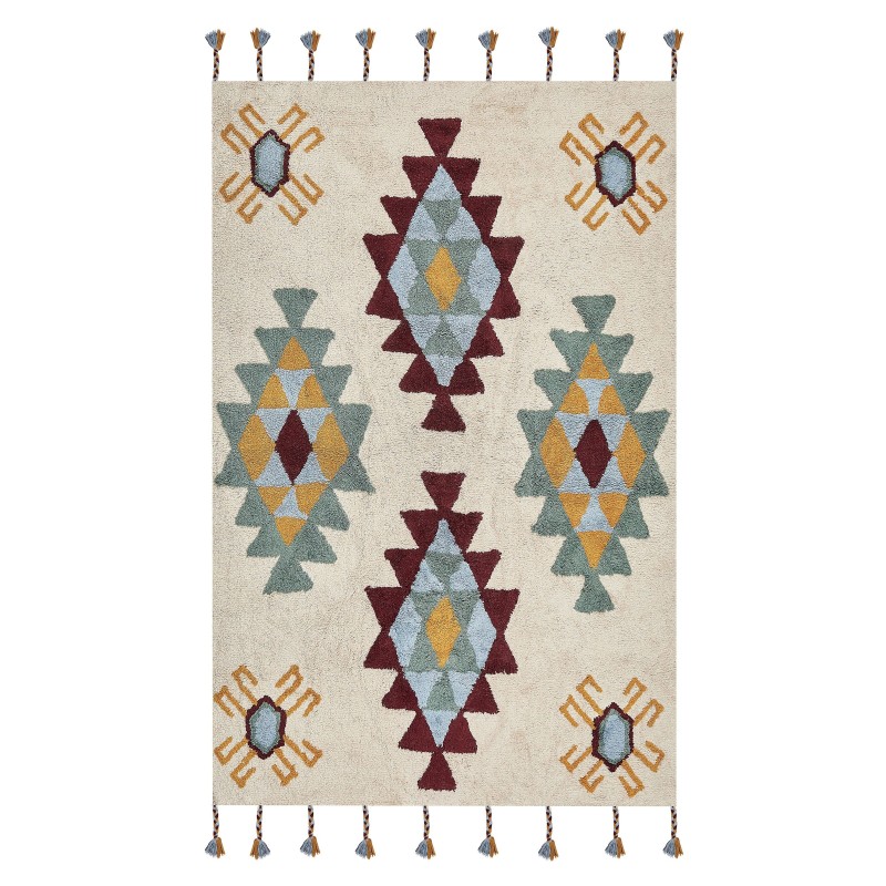 Wenn Sie ungewöhnliche Accessoires mögen, ist dieser Teppich die perfekte Wahl. Das geometrische Muster, inspiriert von der Stammeskultur, macht dieses Produkt zu einem originellen Accessoire, das jedem Raum ein wenig Charakter verleiht. Außerdem ist der Teppich vollständig aus Baumwolle gefertigt, was seine Haltbarkeit und hohen Nutzungskomfort gewährleistet. Er passt hervorragend zu verschiedenen Einrichtungsstilen, von Boho über modern bis traditionell.