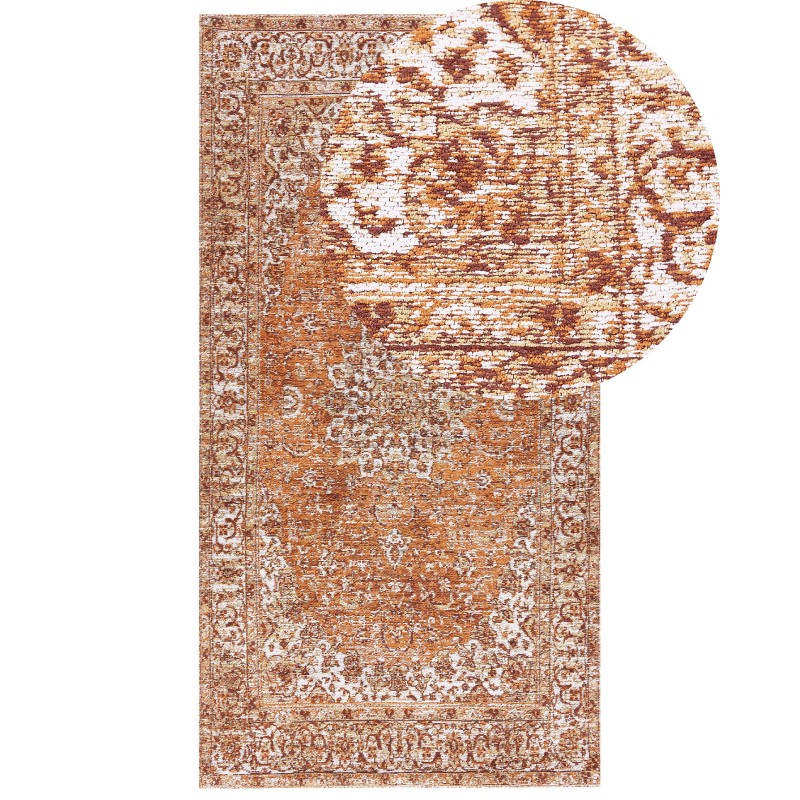Dieser Teppich wird sicherlich die Aufmerksamkeit der Hausbewohner auf sich ziehen und dafür sorgen, dass das Innere Ihrer Wohnung in Erinnerung bleibt. Sein größter Vorteil ist das gealterte, von orientalischen Motiven inspirierte Muster in Orangetönen. Dadurch eignet sich das Accessoire für viele verschiedene Räume, die im Vintage- und Retro-Stil gehalten sind. Das Ganze wurde aus hochwertiger Baumwolle und Polyester gefertigt, was den Teppich strapazierfähig und sehr angenehm im Griff macht.