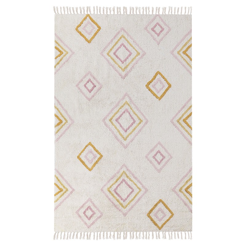 Dieser handgefertigte getuftete Teppich wird eine ausgezeichnete Wahl sein, um Ihr Interieur aufzufrischen. Gebrochenes Weiß in Kombination mit einem mehrfarbigen geometrischen Muster passt zu vielen Stilen und verleiht gleichzeitig einen farbigen Akzent. Die Fransen an den Seiten des Teppichs verleihen ihm einen heimeligen Charakter, der in Ihrem Wohnzimmer perfekt aussehen wird. Er ist aus weicher Baumwolle gefertigt.