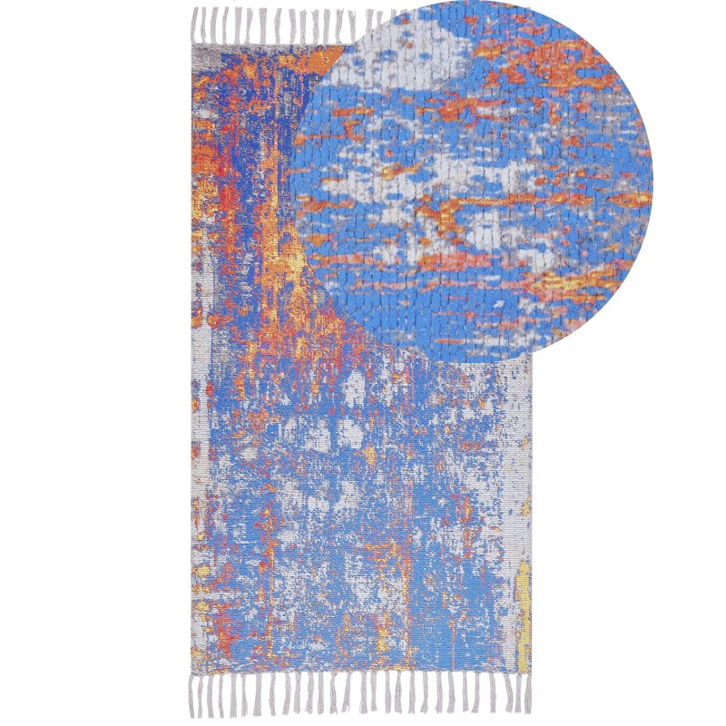 Bringen Sie etwas Gemütlichkeit in Ihr Zuhause mit diesem bezaubernden, handgewebten Teppich. Er verfügt über angenehm weiche Fasern und eignet sich gut neben dem Sofa im Wohnzimmer oder am Bett im Schlafzimmer. Das abstrakte Muster mit auffälligen Blau- und Orangetönen zieht garantiert Blicke auf sich und belebt jedes Dekor. Dieser Teppich ist eine wunderbare Ergänzung für jedes moderne Interieur.