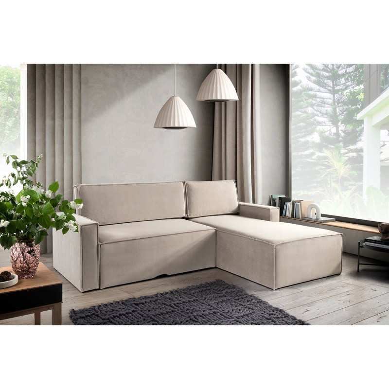Das Ecksofa Moon mit Schlaffunktion und Bettkasten ist ein Möbelstück im modernen Stil, das zu einem modernen Interieur passt, funktional und kompakt dank seiner Abmessungen.