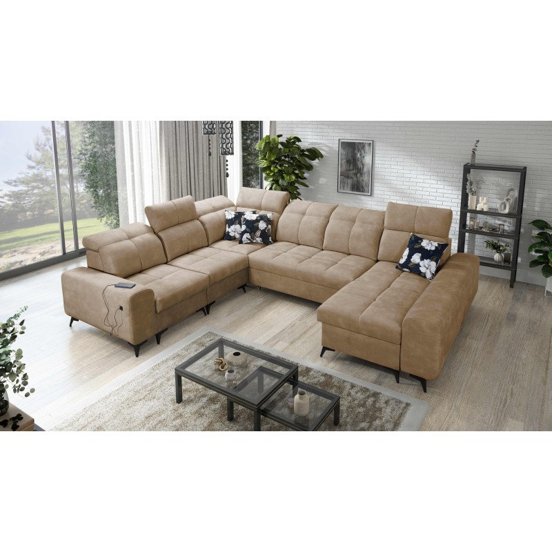 Das Ecksofa Ascot VIII mit Schlaffunktion ist die ideale Lösung für Menschen, die Komfort und Multifunktionalität schätzen. Dank der Möglichkeit, das Möbelstück auszuklappen, kann es leicht in eine zusätzliche Schlafgelegenheit mit einer Fläche von 255x129 cm verwandelt werden. Darüber hinaus ist das Ecksofa mit einem USB-Anschluss ausgestattet, der es ermöglicht, Geräte aufzuladen, ohne den Lieblingsplatz verlassen zu müssen.