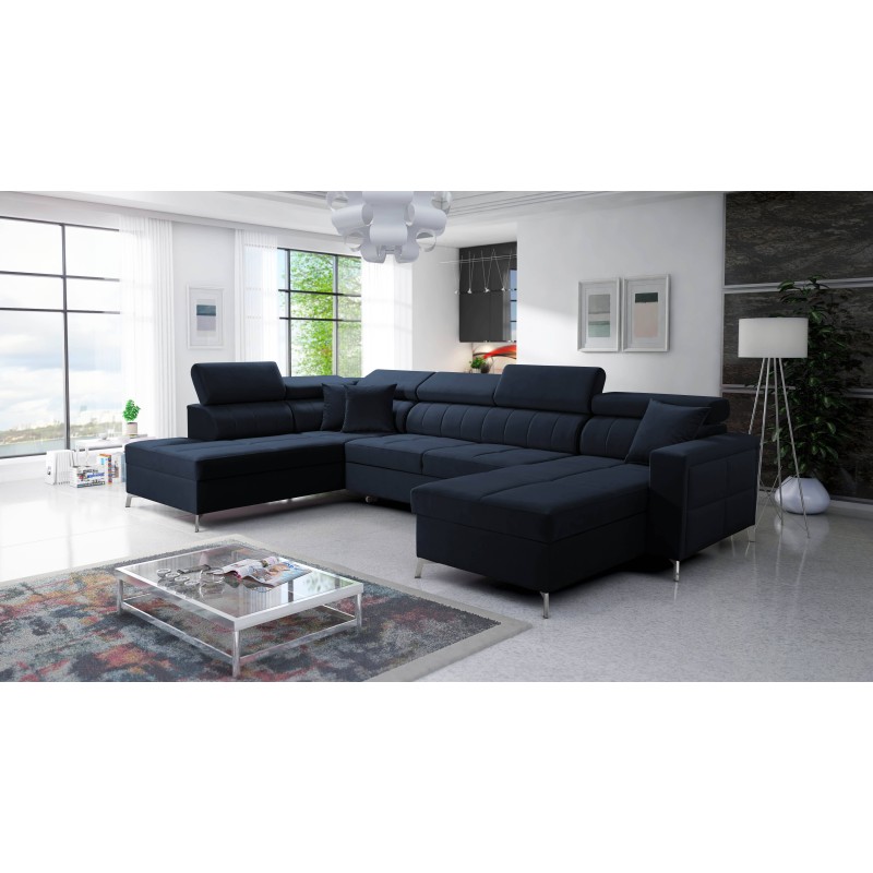 Wir laden Sie ein, sich mit unserem U-förmigen Ecksofa - Oslo VI - vertraut zu machen. Dieses außergewöhnliche Möbelstück mit Schlaffunktion und einem praktischen Bettkasten zeichnet sich durch einen einzigartigen Stil und hervorragenden Nutzungskomfort aus. Hergestellt aus hochwertigen Materialien, darunter der Stoff Velvet, Jaguar 2186, ist es äußerst langlebig und ästhetisch.