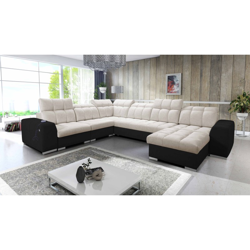 Das U-förmige Ecksofa Prisma VIII mit Schlaffunktion, USB-Anschluss und Bettkasten in Stoff Terra 80 – ein außergewöhnliches Möbelstück, das Sie mit Stil und Funktionalität begeistern wird.