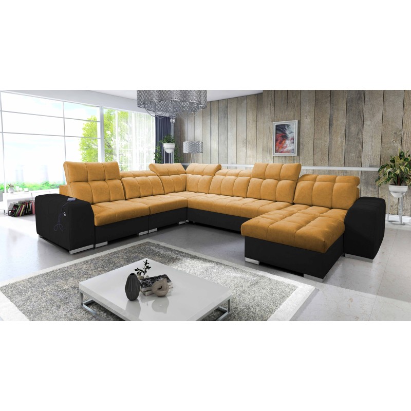 Das U-förmige Ecksofa Prisma VIII mit Schlaffunktion, USB-Anschluss und Bettkasten in Stoff Terra 80 – ein außergewöhnliches Möbelstück, das Sie mit Stil und Funktionalität begeistern wird.