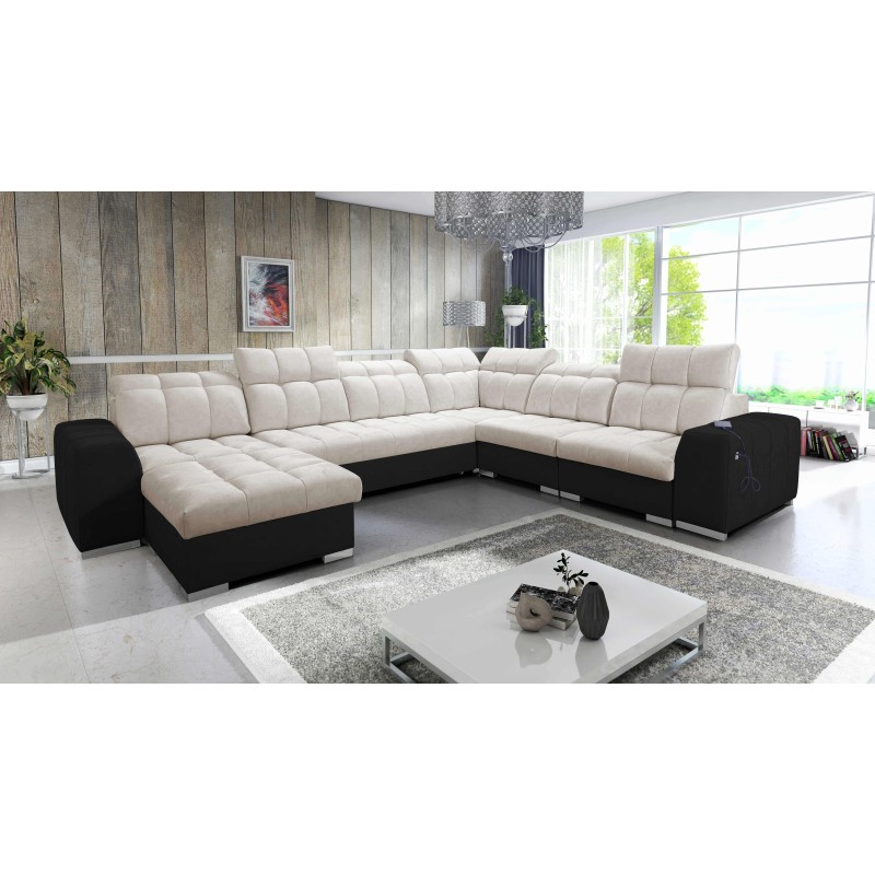 U-förmiges Ecksofa Prisma VIII mit Schlaffunktion, USB-Anschluss und Bettkasten, Stoff Terra 13 + schwarzes Kunstleder