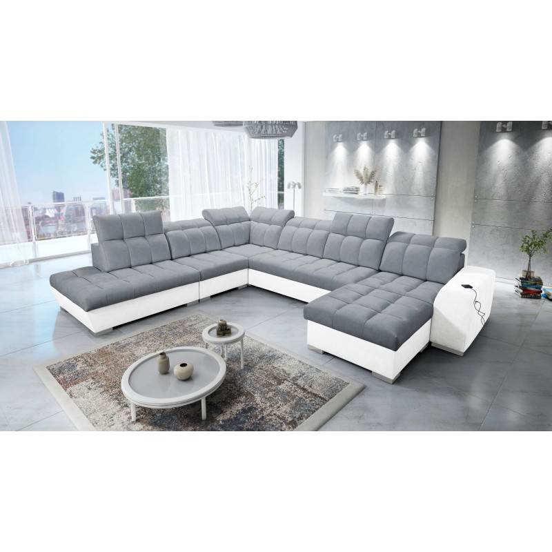 U-förmiges Ecksofa Prisma X mit Schlaffunktion, USB-Anschluss und Bettkasten, Stoff Terra 92 + Kunstleder