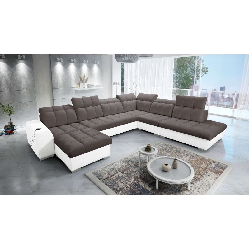 U-förmiges Ecksofa Prisma X mit Schlaffunktion, USB-Anschluss und Bettkasten, Stoff Terra 26 + Kunstleder