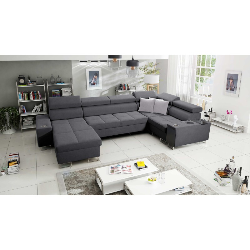 U-förmiges Ecksofa Orbix IV Mini mit Schlaffunktion, verstellbaren Kopfstützen, USB-Anschluss und Bettkasten in Stoff Sawana 96.