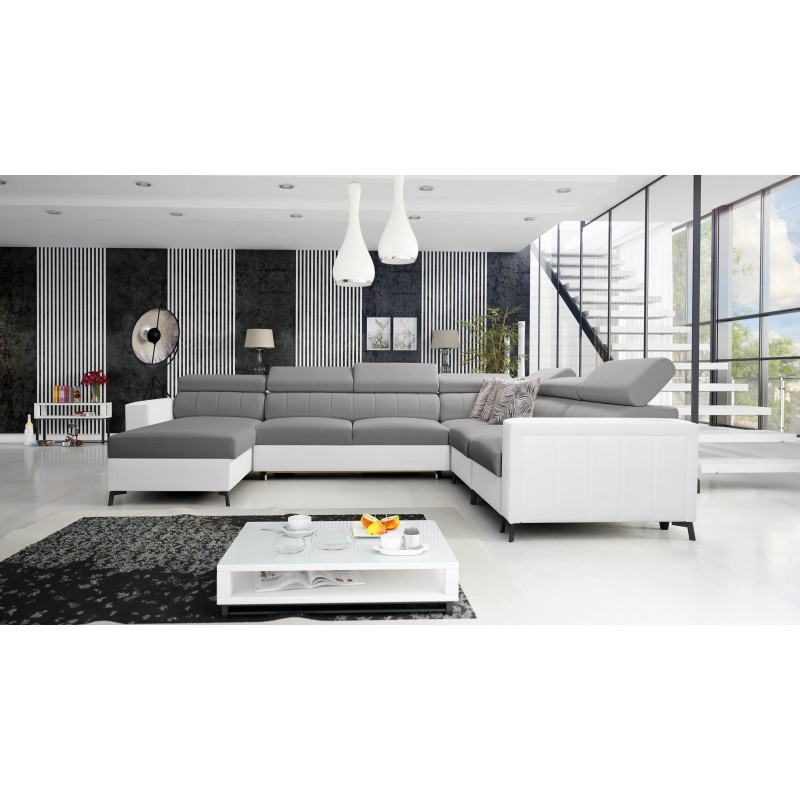 Das Ecksofa Arco VII vereint modernes Design mit höchstem Nutzungskomfort. Dank der verstellbaren Kopfstützen und der gepolsterten Rückseite bietet es volle Entspannung und Bequemlichkeit bei jeder Ruhepause. Zusätzlich lässt es sich mühelos in ein echtes, bequemes Bett mit einer Liegefläche von 288x127 cm verwandeln - ideal für Gäste oder den täglichen Gebrauch.