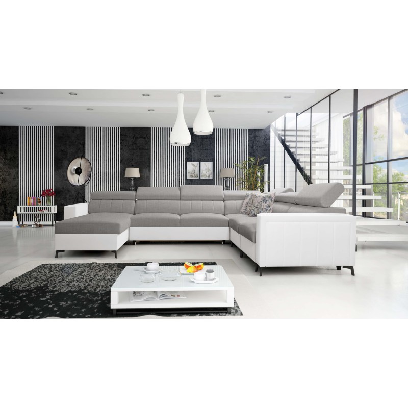 U-förmiges Ecksofa Arco VII mit Schlaffunktion, verstellbare Kopfstützen Stoff Sawana 11 + Kunstleder