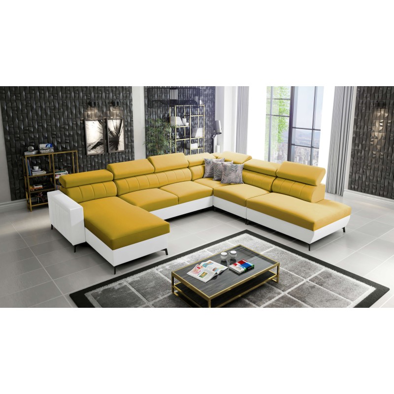 Präsentieren Sie Ihr Zuhause von seiner besten Seite, indem Sie sich für das U-förmige Sofa Arco IX entscheiden. Dieses außergewöhnliche Möbelstück ist nicht nur das Zentrum jedes Wohnzimmers, sondern erfüllt auch eine praktische Funktion, indem es einen perfekten Ort zum Entspannen, Schlafen und Relaxen im Kreis von Familie und Freunden bietet. Aus weichem, angenehm anzufassendem Velvet-Stoff Mono 236 + Kunstleder gefertigt, zeichnet sich das Sofa durch außergewöhnliche Haltbarkeit und einfache Reinigung aus, was eine lang anhaltende Zufriedenheit bei der Nutzung garantiert.
