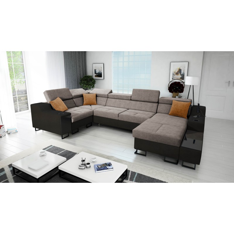 U-förmiges Sofa Avanti IV Mini mit Schlaffunktion und Lampe mit USB-Anschluss, Stoff Whisper 5 + schwarzes Kunstleder