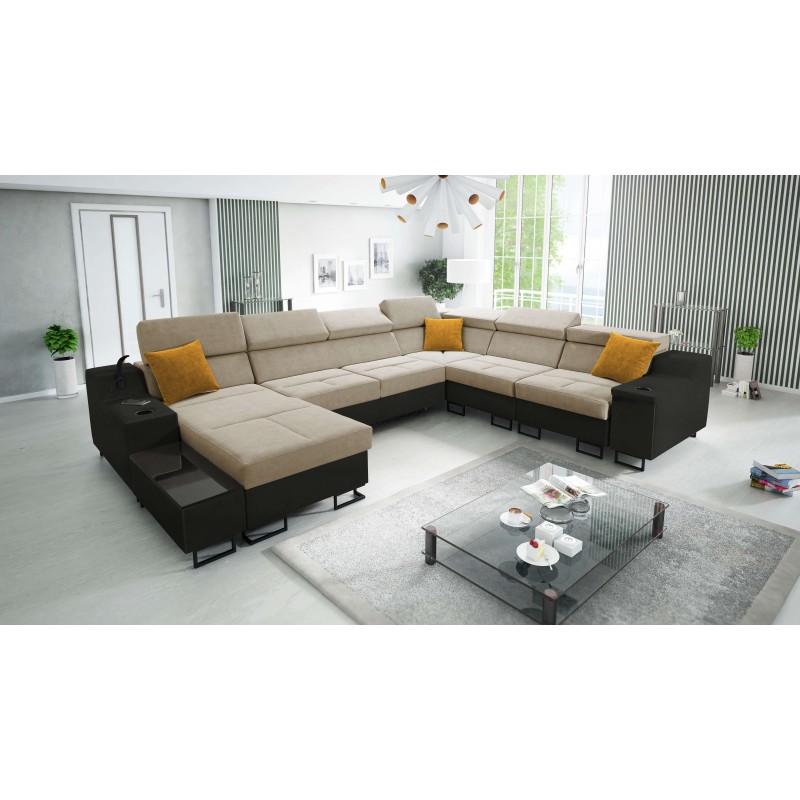 U-förmiges Sofa Avanti VIII mit Schlaffunktion und Lampe mit USB-Anschluss Stoff Whisper 3 + schwarzes Kunstleder