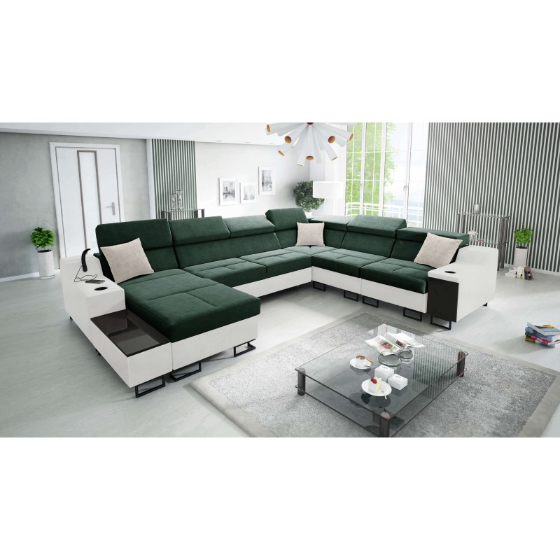 U-förmiges Ecksofa Avanti VIII mit Schlaffunktion und Lampe mit USB-Anschluss, Stoff Whisper 11 + Ökoleder.