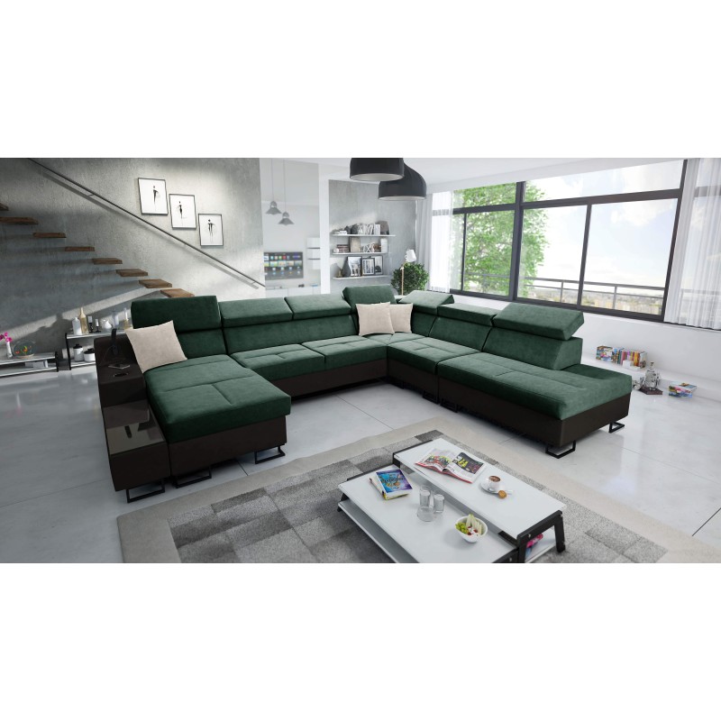 Entdecken Sie Luxus und Komfort, die das U-förmige Ecksofa Avanti X mit Schlaffunktion und Lampe mit USB-Anschluss bietet – bezogen mit elegantem, strapazierfähigem Veloursstoff, Whisper 11 + schwarzem Ökoleder. Dieses moderne und zugleich funktionale Möbelstück wurde für diejenigen entworfen, die nicht nur Stil, sondern auch Praktikabilität schätzen. Es wurde mit Liebe zum Detail entworfen, wodurch es eine einzigartige Kombination aus Ästhetik und Komfort schafft.
