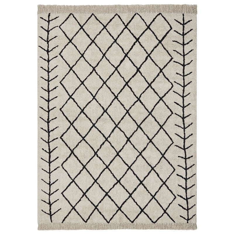 Coloca esta alfombra original en tu salón para impresionar a todos los miembros de la familia. El producto atraerá la atención sin problema debido a su patrón geométrico, mantenido en un color negro que contrasta con el resto de la alfombra. Además, en ambos extremos se han colocado flecos decorativos, lo que hace que la alfombra se vea mejor en espacios boho. Todo está hecho de algodón, por lo que el producto es duradero, suave y agradable al tacto.