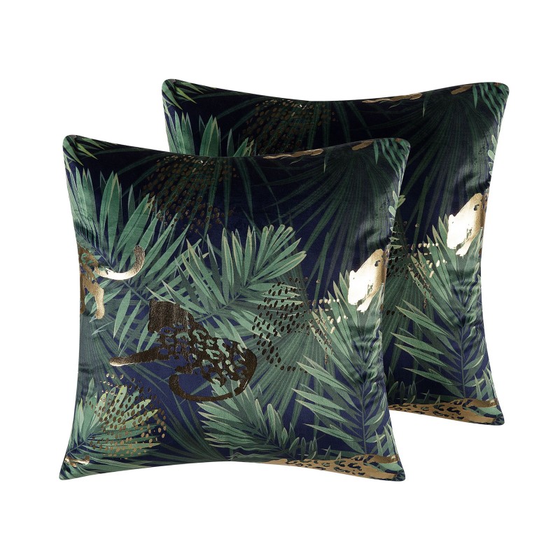 Cojines decorativos que no pasarán desapercibidos. Las fundas están hechas de terciopelo de alta calidad y están adornadas con hojas de palma verdes, sobre las cuales destacan animales metálicos. Gracias a su diseño fresco, seguramente embellecerán maravillosamente cualquier sofá, sillón o cama.
