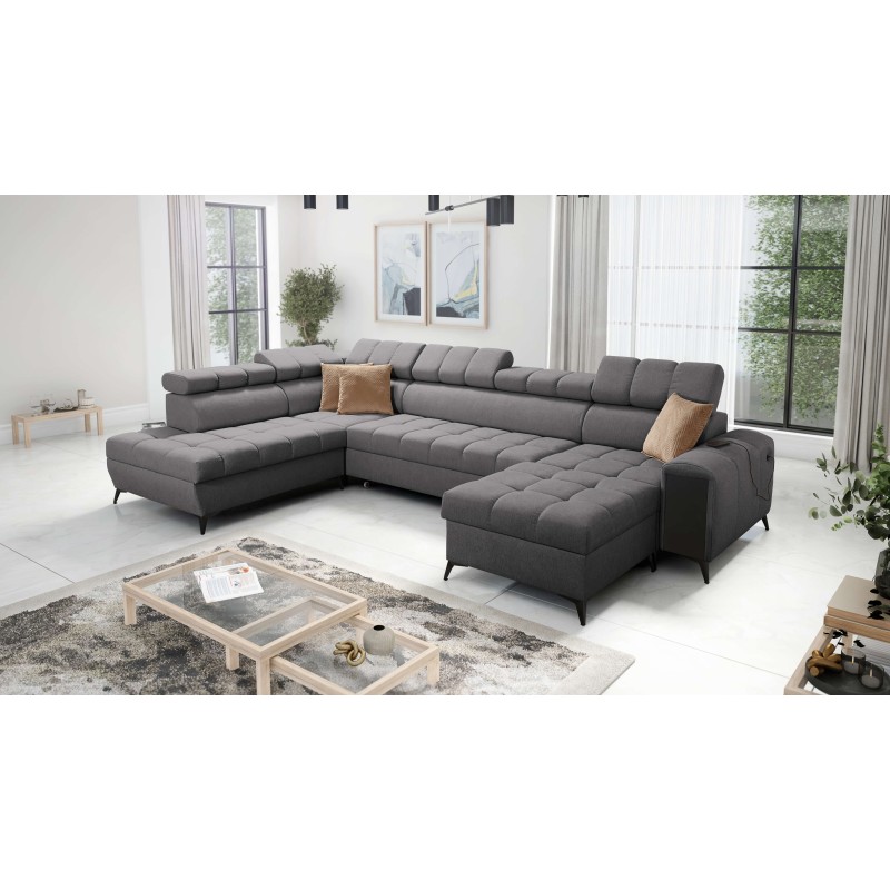 Te invitamos a conocer el Sofá Esquinero en forma de U Venna VI, un elegante lugar de encuentro y descanso para toda la familia. Esta propuesta única está cubierta con una tela suave y duradera, Plusz, Avra 17, que se combina perfectamente con cualquier decoración de interiores. Su forma monumental le da al espacio un carácter refinado y, gracias a su diseño bien pensado, es tanto práctico como extremadamente cómodo.