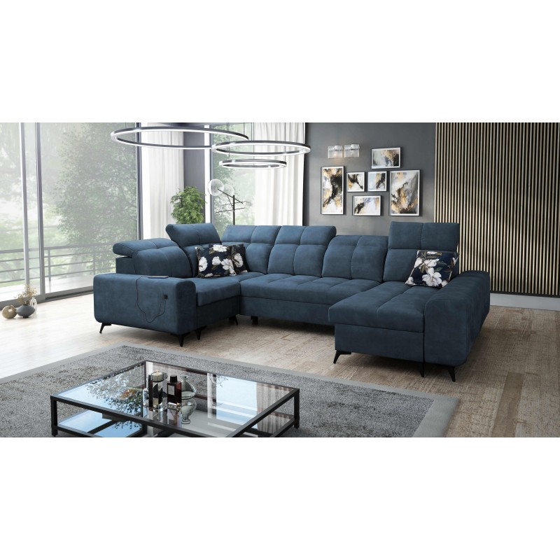 Sofá esquinero en forma de U Ascot IV con función de cama, puerto USB y reposacabezas ajustables, tela Wave 14