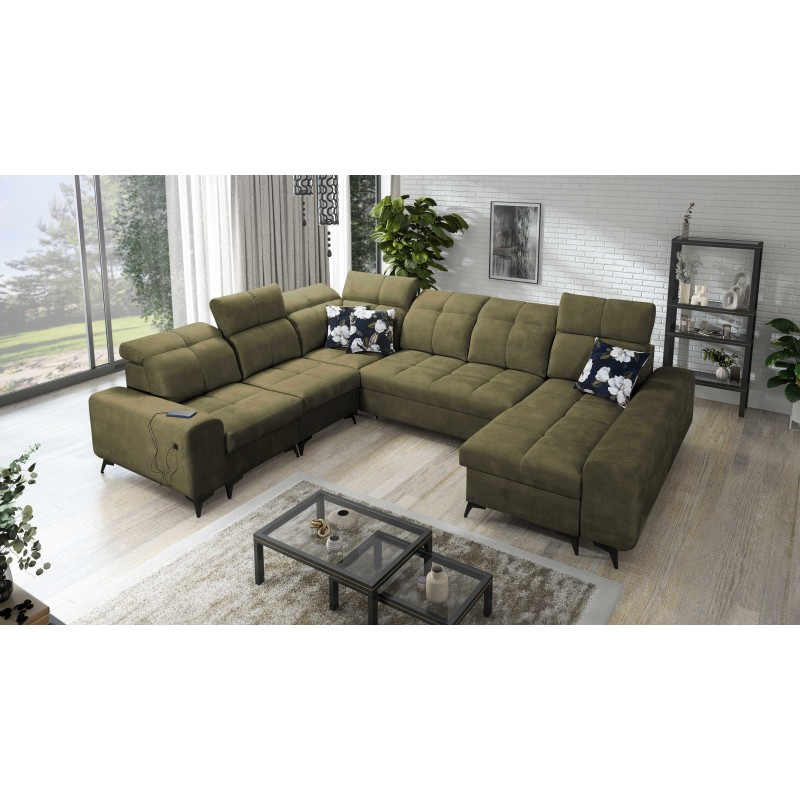 Sofá esquinero en forma de U Ascot VIII con función de cama, puerto USB y reposacabezas ajustables, tela Wave 11.