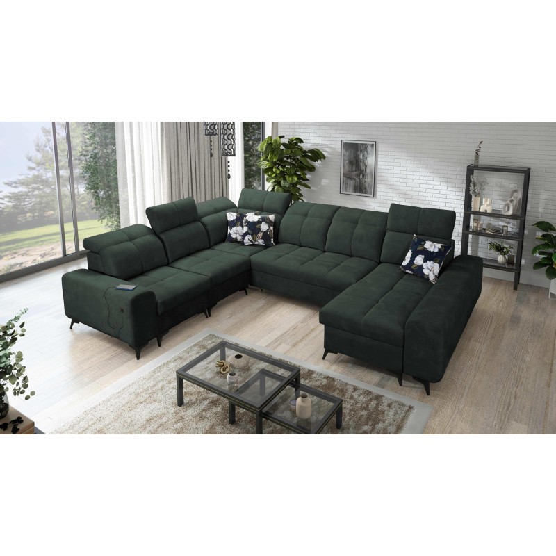 Sofá esquinero en forma de U Ascot VIII con función de cama, puerto USB y reposacabezas ajustables, tela Wave 12.