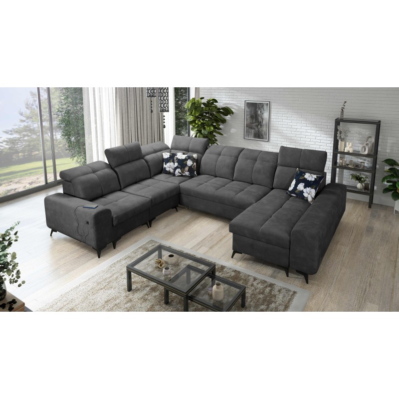 Sofá esquinero en forma de U Ascot VIII con función de cama, puerto USB y reposacabezas ajustables, tela Wave 16