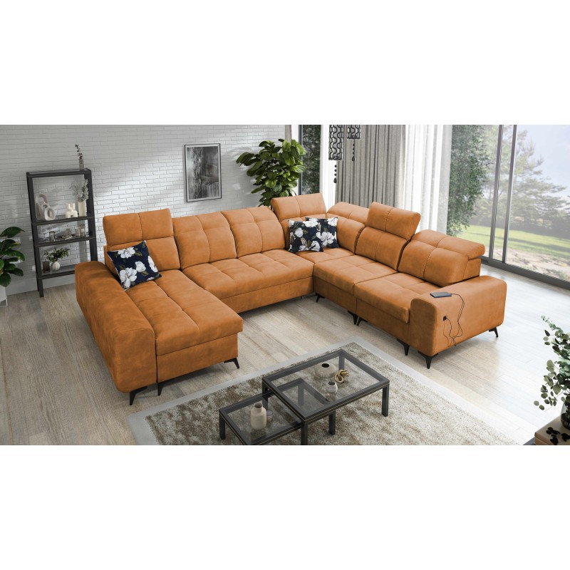 Sofá esquinero en forma de U Ascot VIII con función de cama, puerto USB y reposacabezas ajustables tela Wave 6