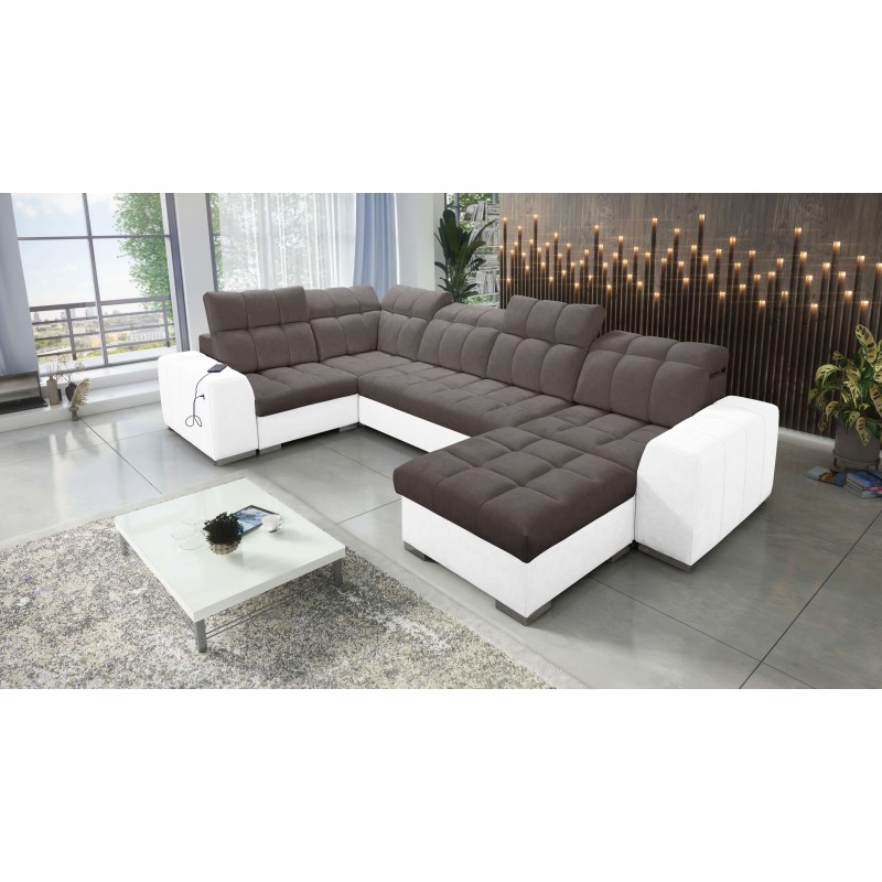 Sofá esquinero en forma de U Prisma IV con función para dormir, puerto USB y compartimento para ropa de cama, tela Terra 26 + ec