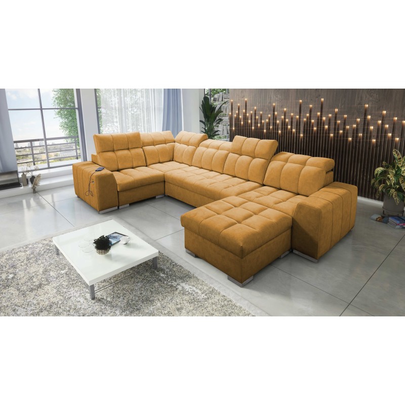 Sofá en forma de U Prisma IV con función de cama, puerto USB y compartimento para ropa de cama, tela Terra 48