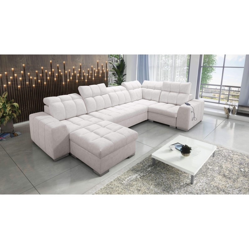 Sofá esquinero en forma de U Prisma IV con función de cama, puerto USB y contenedor para ropa de cama, tela Terra 06.