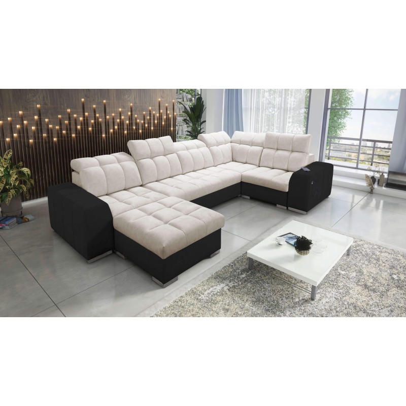 Sofá esquinero en forma de U Prisma IV con función de cama, puerto USB y contenedor para ropa de cama, tela Terra 13 + ecopiel n