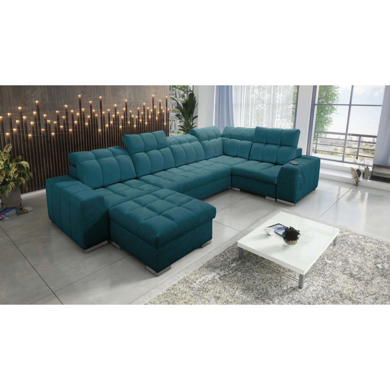 Sofá esquinero en forma de U Prisma IV con función de cama, puerto USB y contenedor para ropa de cama, tela Terra 75.