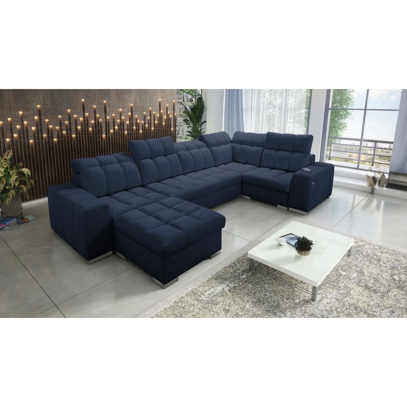 Sofá esquinero en forma de U Prisma IV con función de cama, puerto USB y compartimento para ropa de cama en tela Terra 79.
