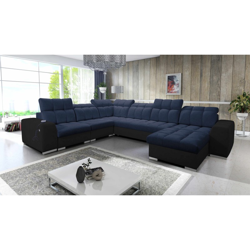 Sofá esquinero en forma de U Prisma VIII con función para dormir, puerto USB y contenedor para ropa de cama, tela Terra 79 + cue