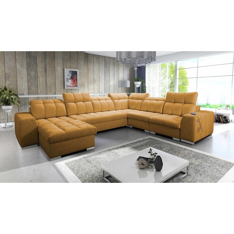 Sofá esquinero en forma de U Prisma VIII con función de cama, puerto USB y contenedor para ropa de cama, tela Terra 48