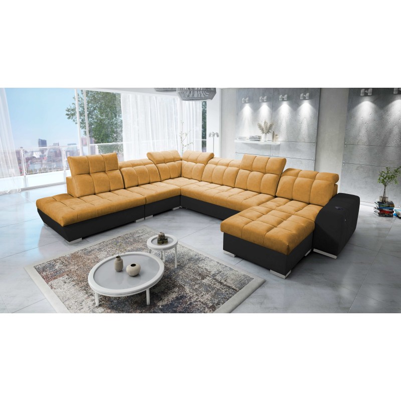 Sofá esquinero en forma de U Prisma X con función de cama, puerto USB y contenedor para ropa de cama en tela Terra 48 + Eco-cuer