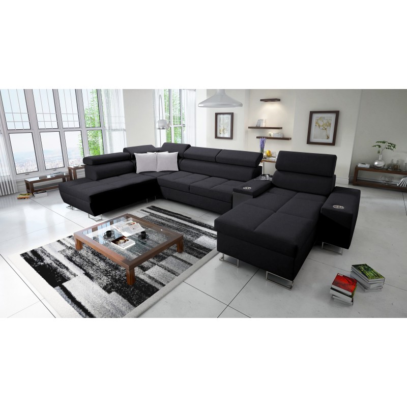 Sofá esquinero en forma de U Orbix V con función de sueño, reposacabezas ajustables, puerto USB y compartimento para ropa de cam