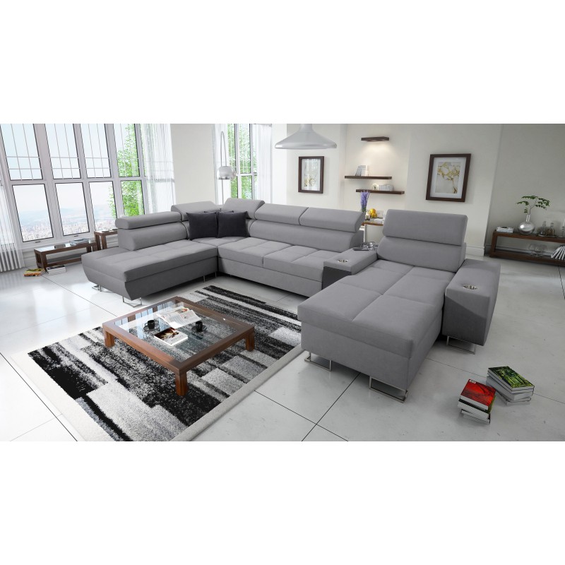 Sofá esquinero en forma de U Orbix V con función de cama, reposacabezas ajustables, puerto USB y compartimento para ropa de cama