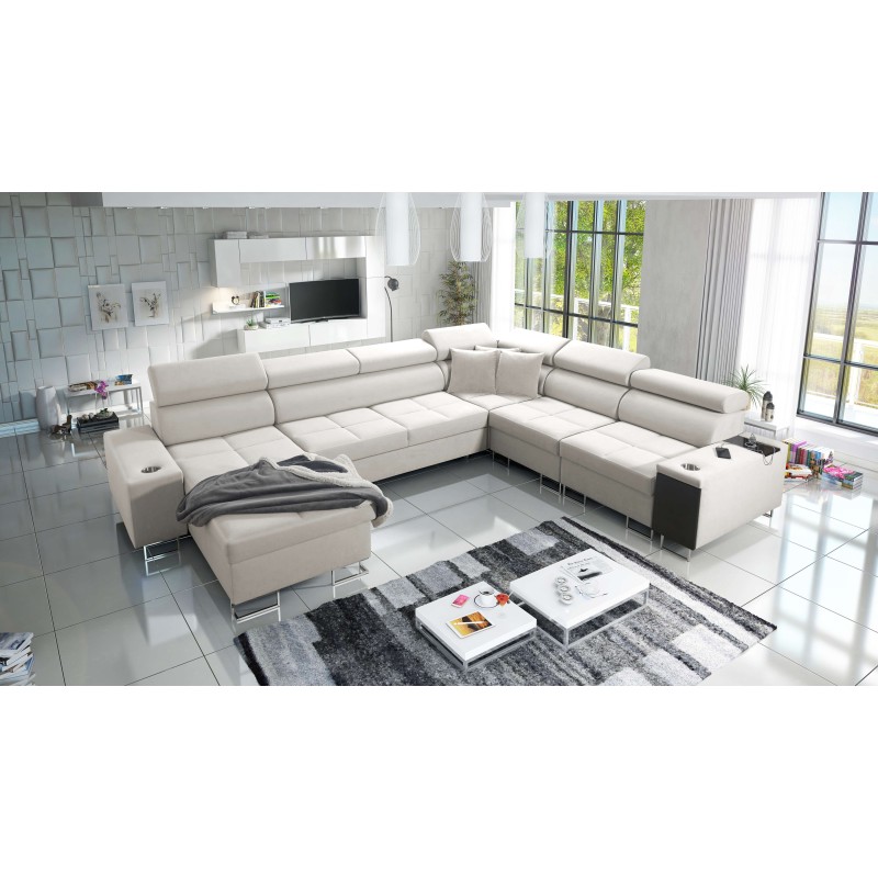 Sofá esquinero en forma de U Orbix VIII con función de dormir, reposacabezas ajustables, puerto USB y compartimento para ropa de