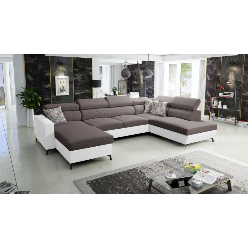 Sofá esquinero en forma de U Arco VI con función de cama, reposacabezas ajustables, tela Mono 234 + Eco-cuero.