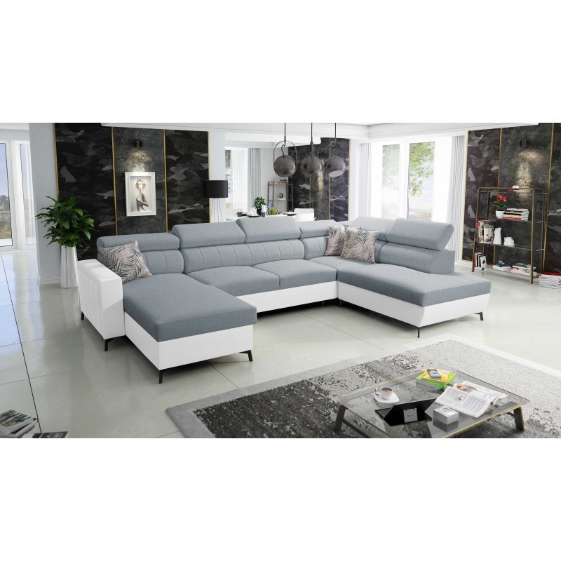 Sofá esquinero en forma de U Arco VI con función para dormir, reposacabezas ajustables, tela Sawana 72 + Eco-cuero.