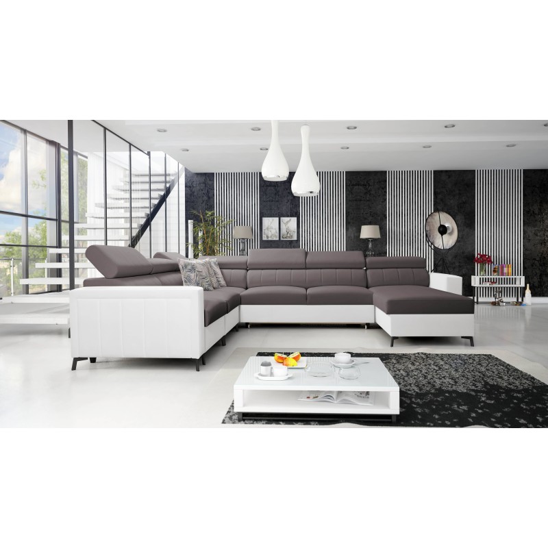 Sofá en forma de U Arco VII con función de cama, reposacabezas ajustables tela Mono 234 + Ecocuero.
