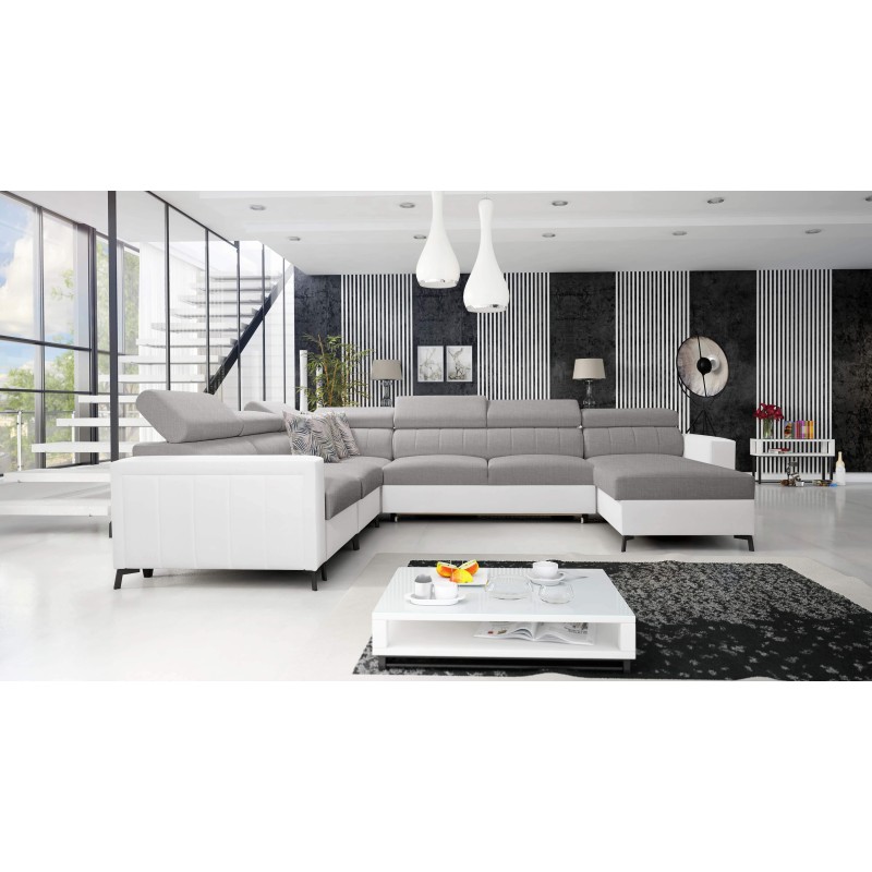 Sofá esquinero en forma de U Arco VII con función para dormir, reposacabezas ajustables tela Sawana 11 + Eco-cuero